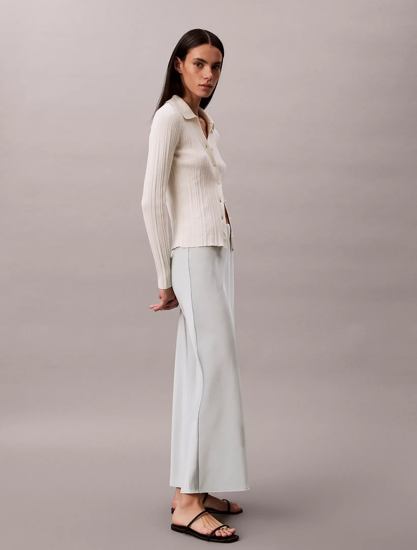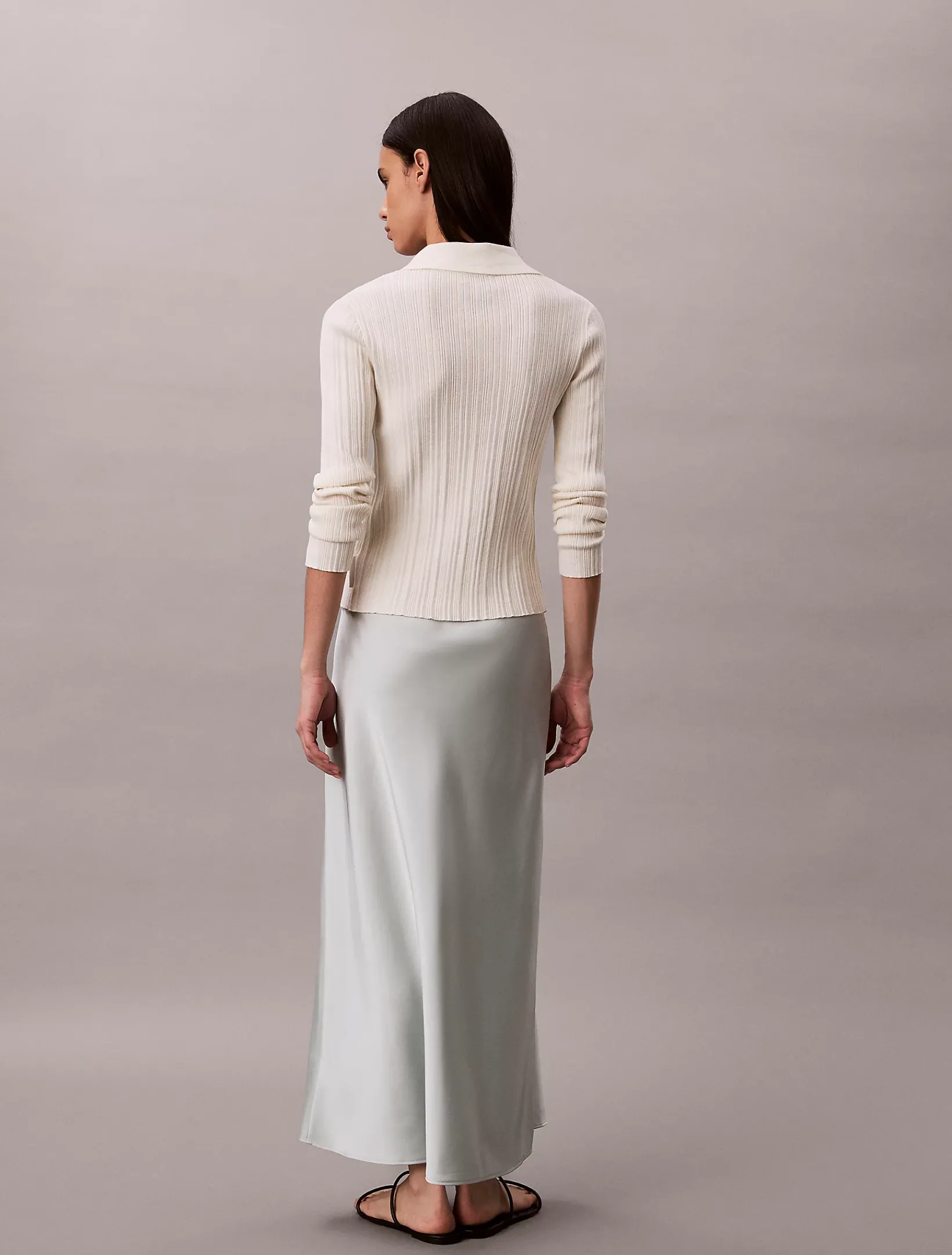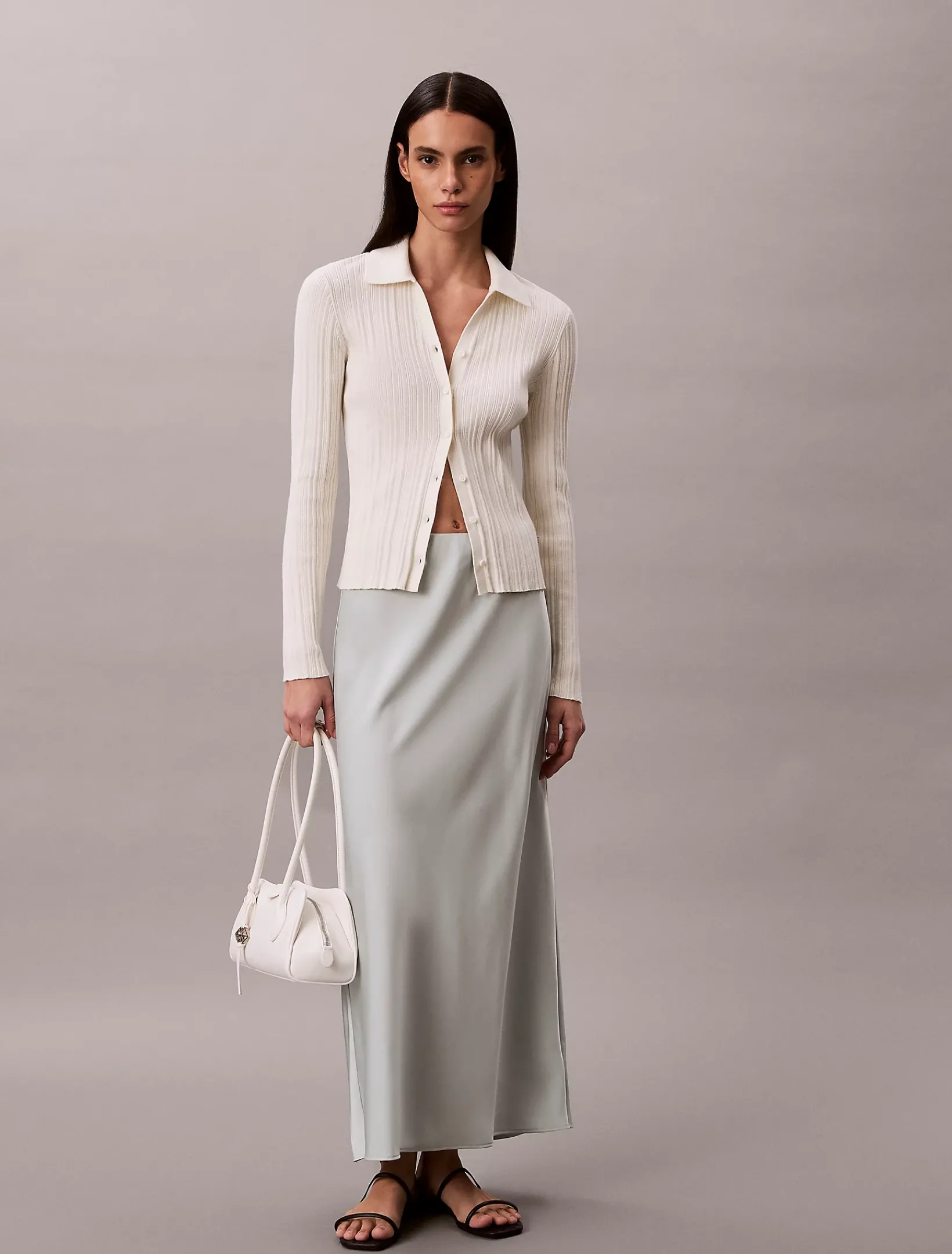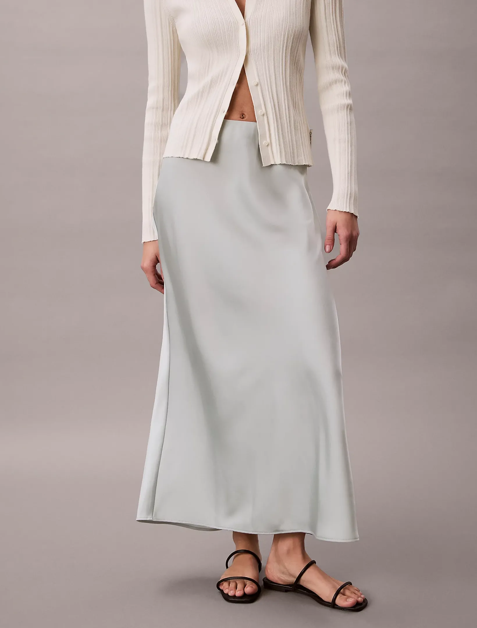 Dieser Rock hat eine lange, verlängernde Silhouette aus glattem Satin mit leuchtendem Glanz.