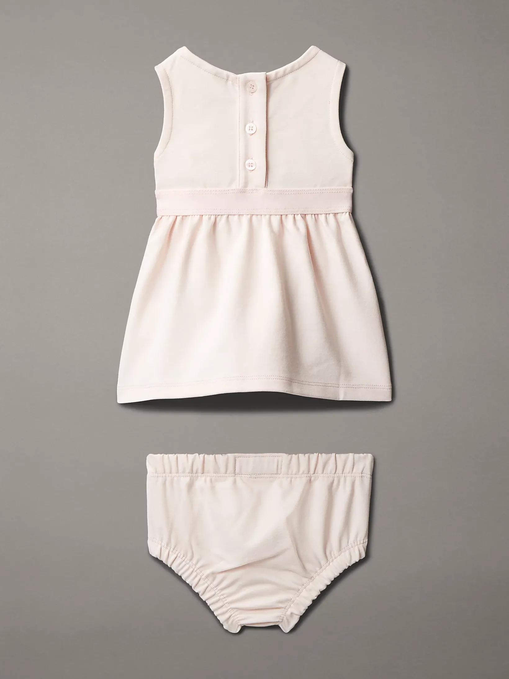 • Kleid: Rundhalsausschnitt, Knopfverschluss hinten, ärmellos, geraffte Details an der Taille, farblich abgestimmtes Calvin Klein Logo-Tape am Bund