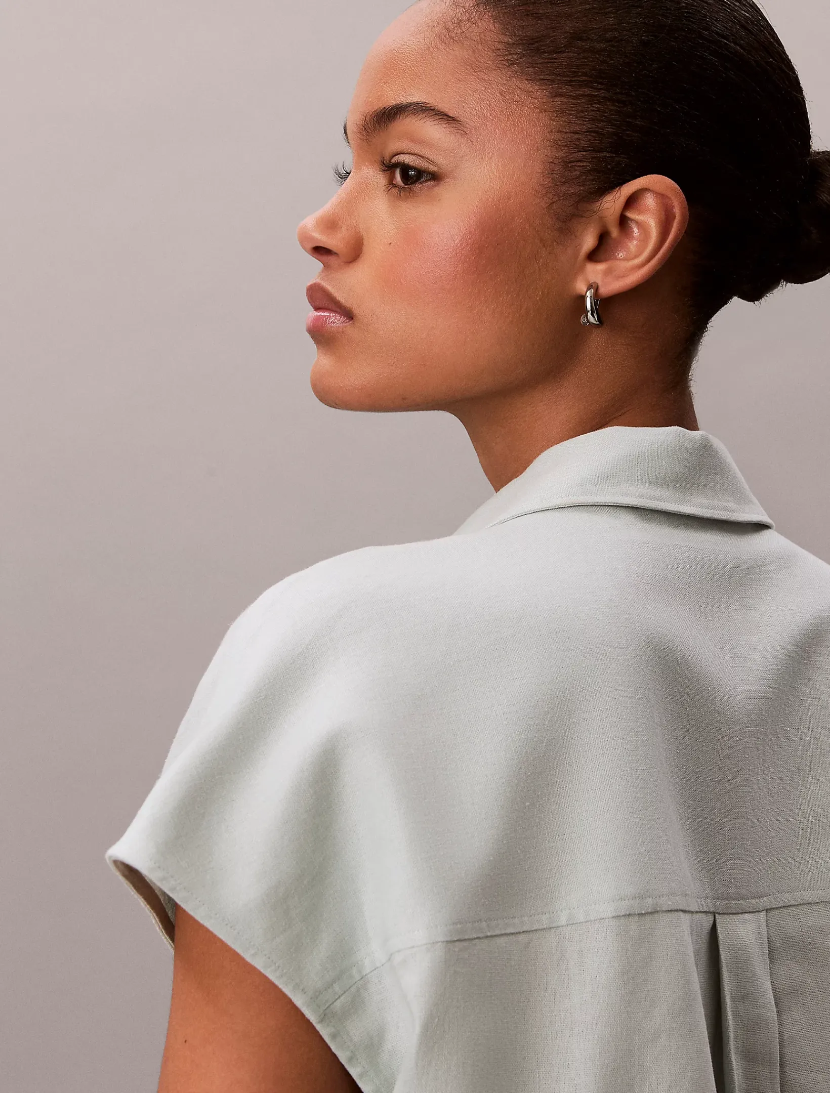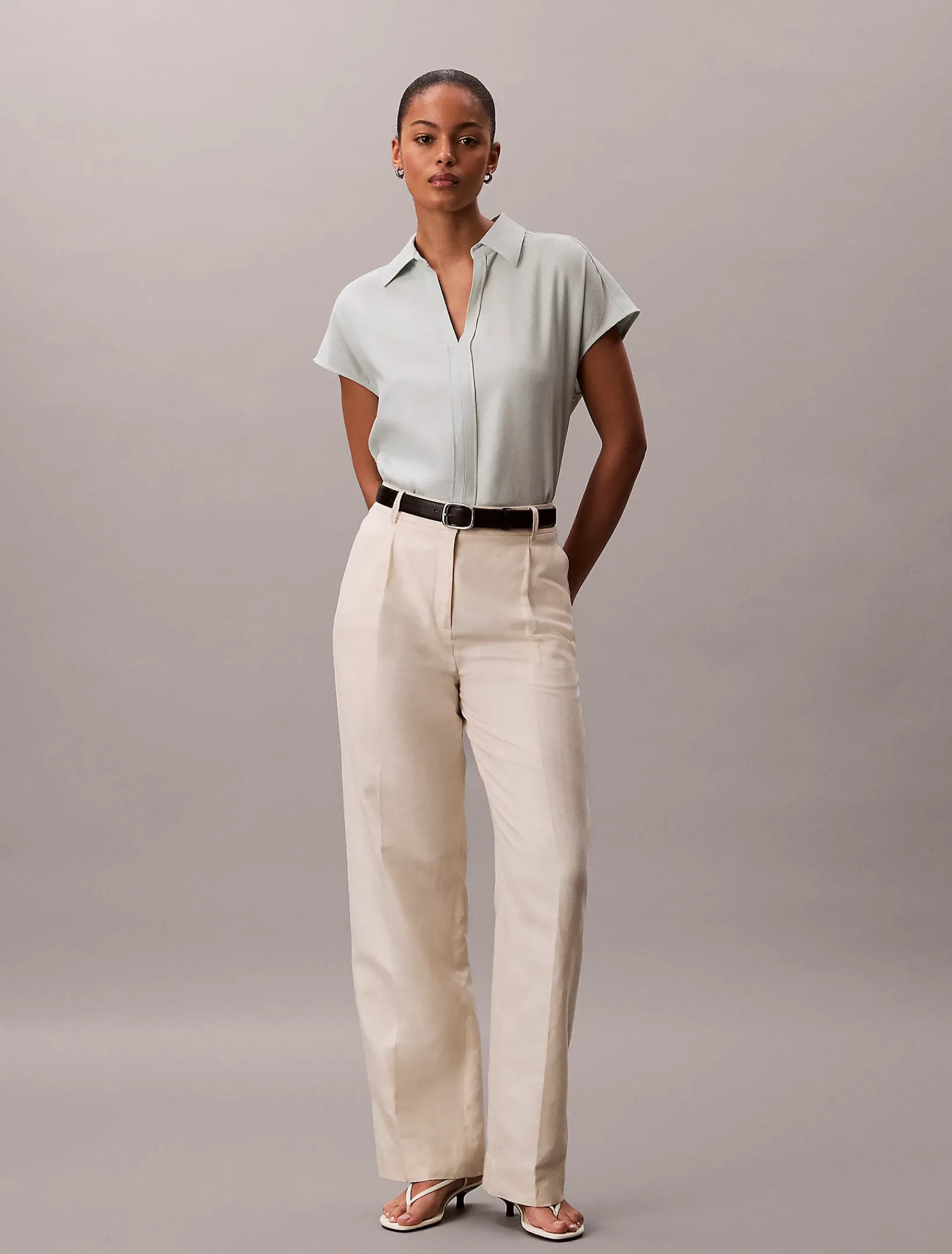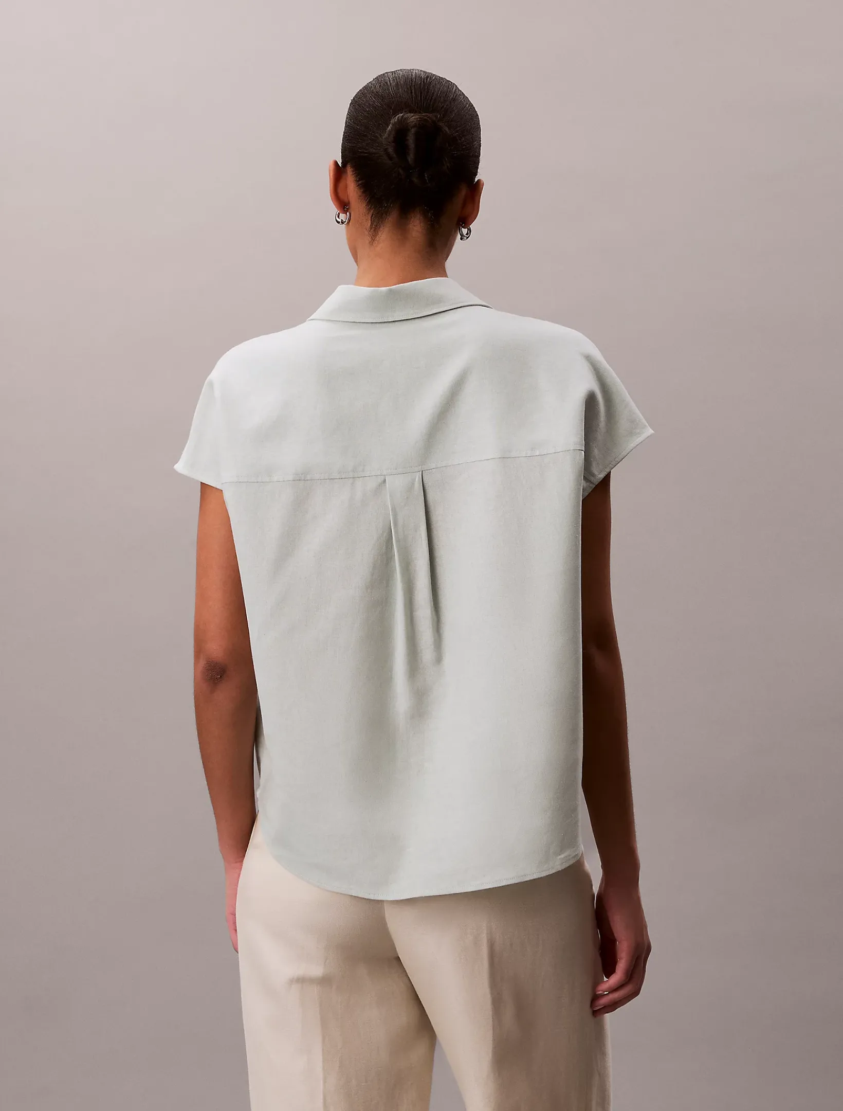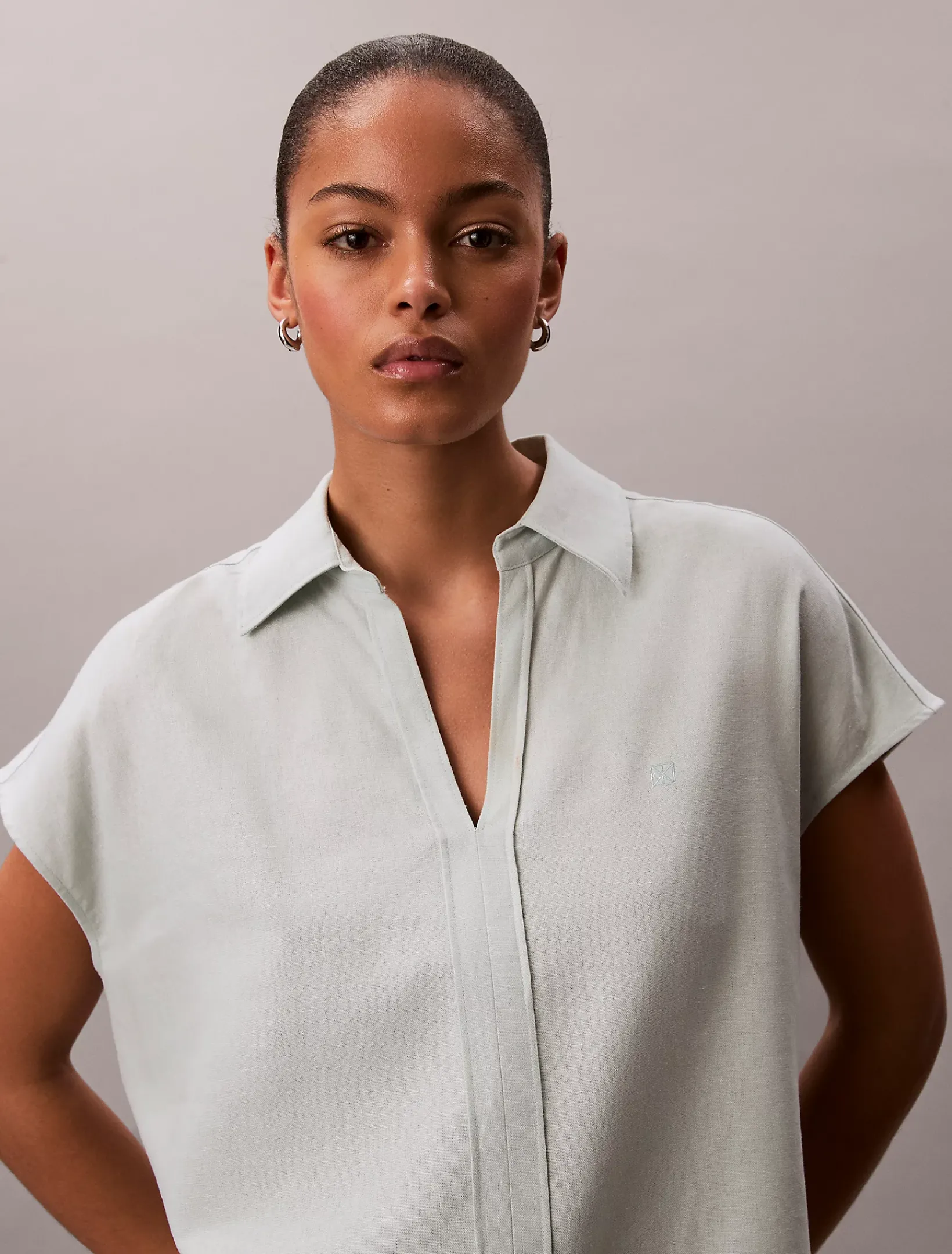 Dieses Hemd aus einem Leinen-Mix hat eine elegante, zurückhaltende Silhouette mit knopfloser Knopfleiste und offenem spitzem Kragen.