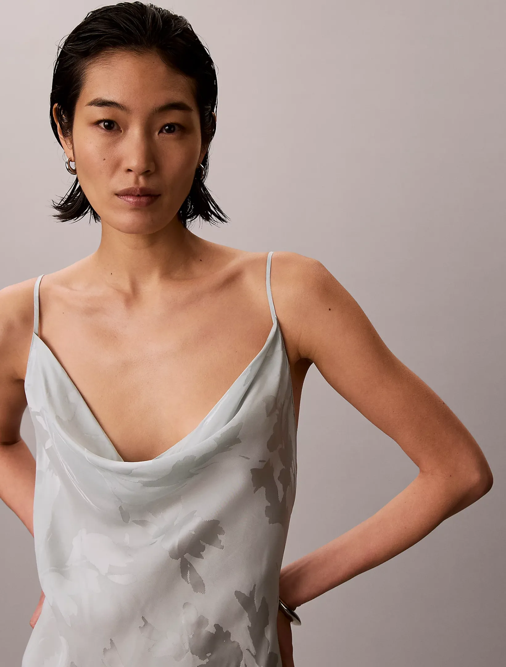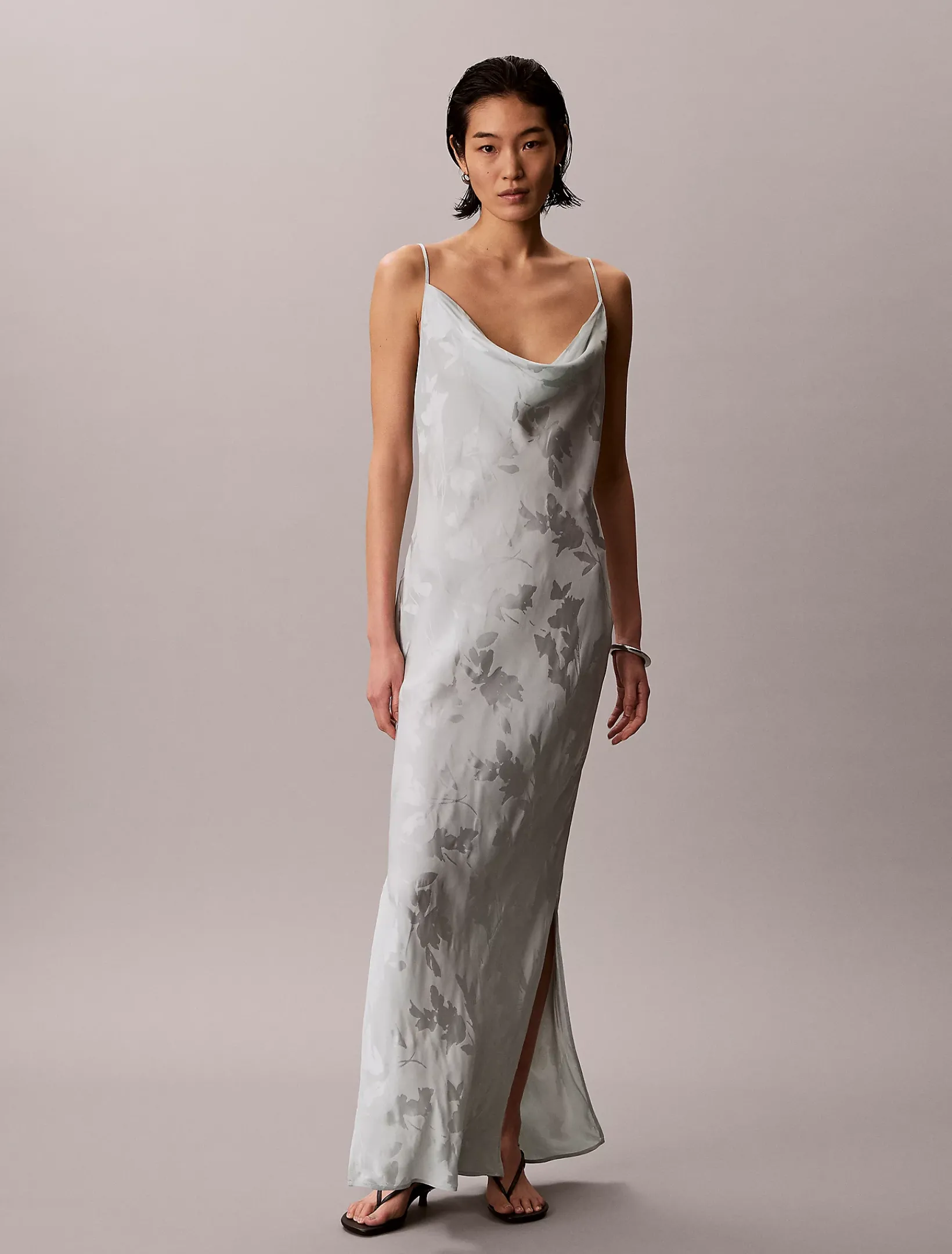 Dieses Kleid ist aus einem matten und glänzenden Stoff gefertigt, der schräg geschnitten ist, um eine fließende, körpernahe Silhouette zu schaffen.