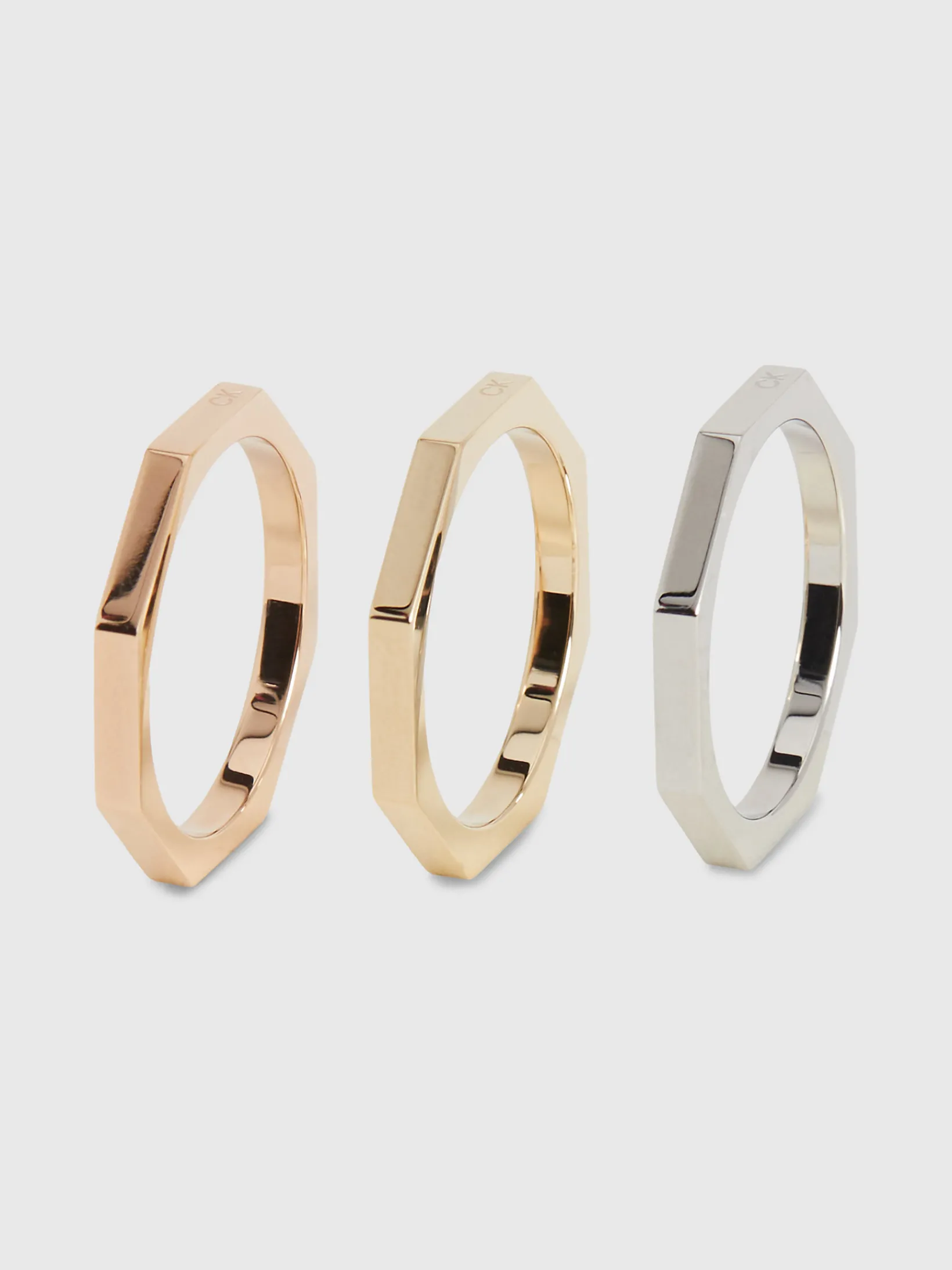Geometrische Formen in 3-teiligem Ring-Set mit geätztem CK Logo für einen lässigen Stapel-Look.