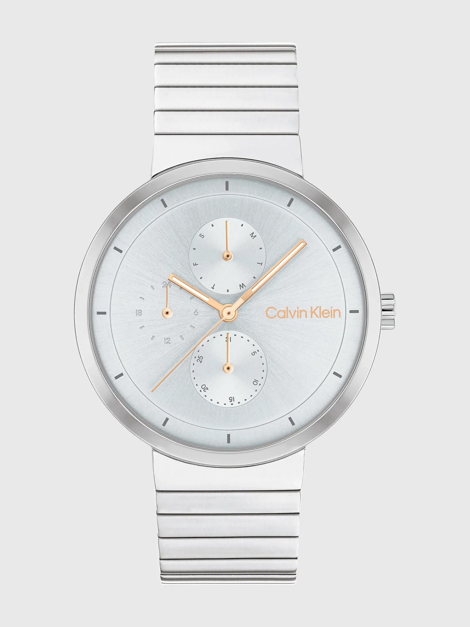 Unverwechselbar CK. Diese Multifunktionsuhr hat ein Gliederarmband und ein modernes, minimalistisches Zifferblatt mit Sonnenschliff für einen vielseitigen, alltäglichen Stil.