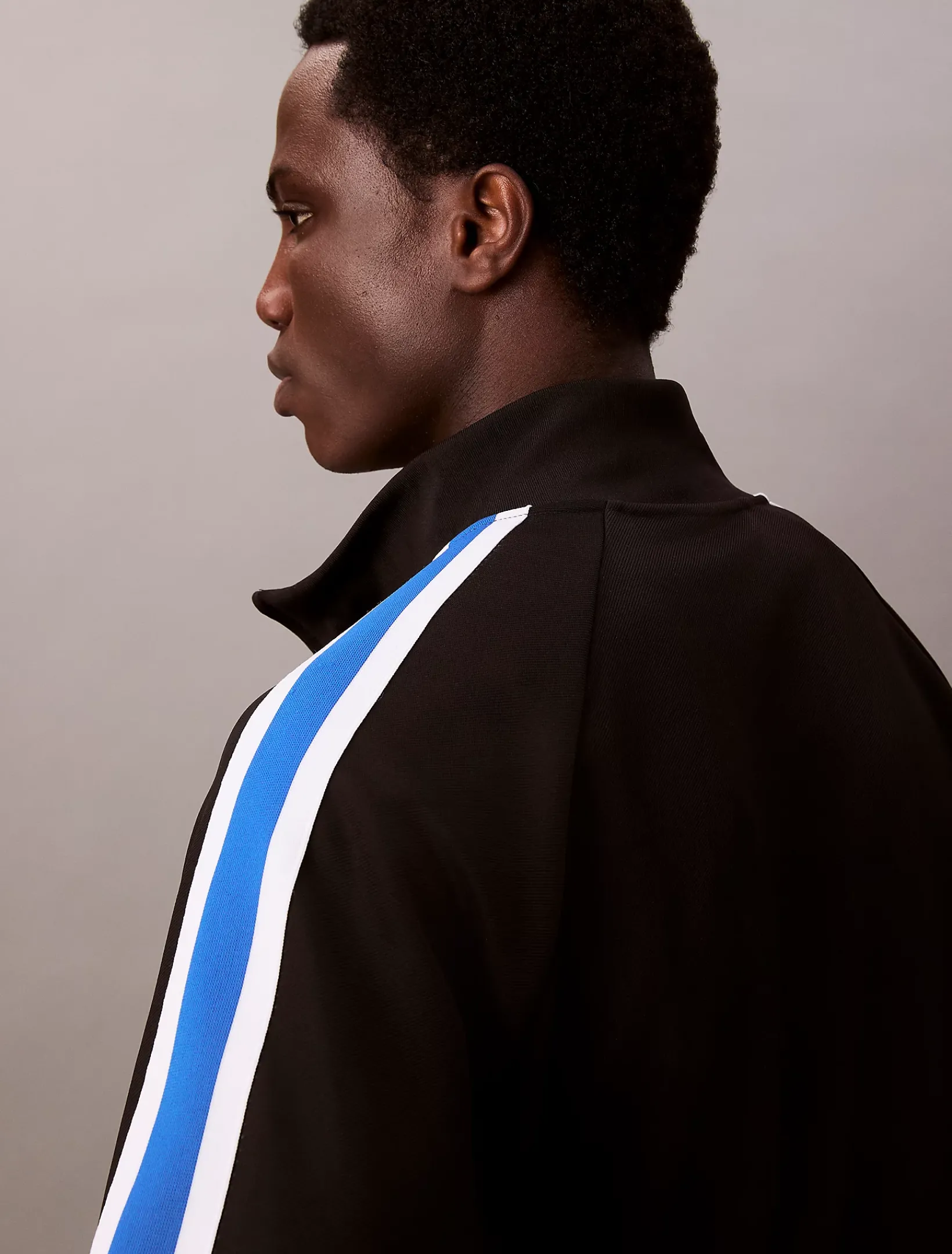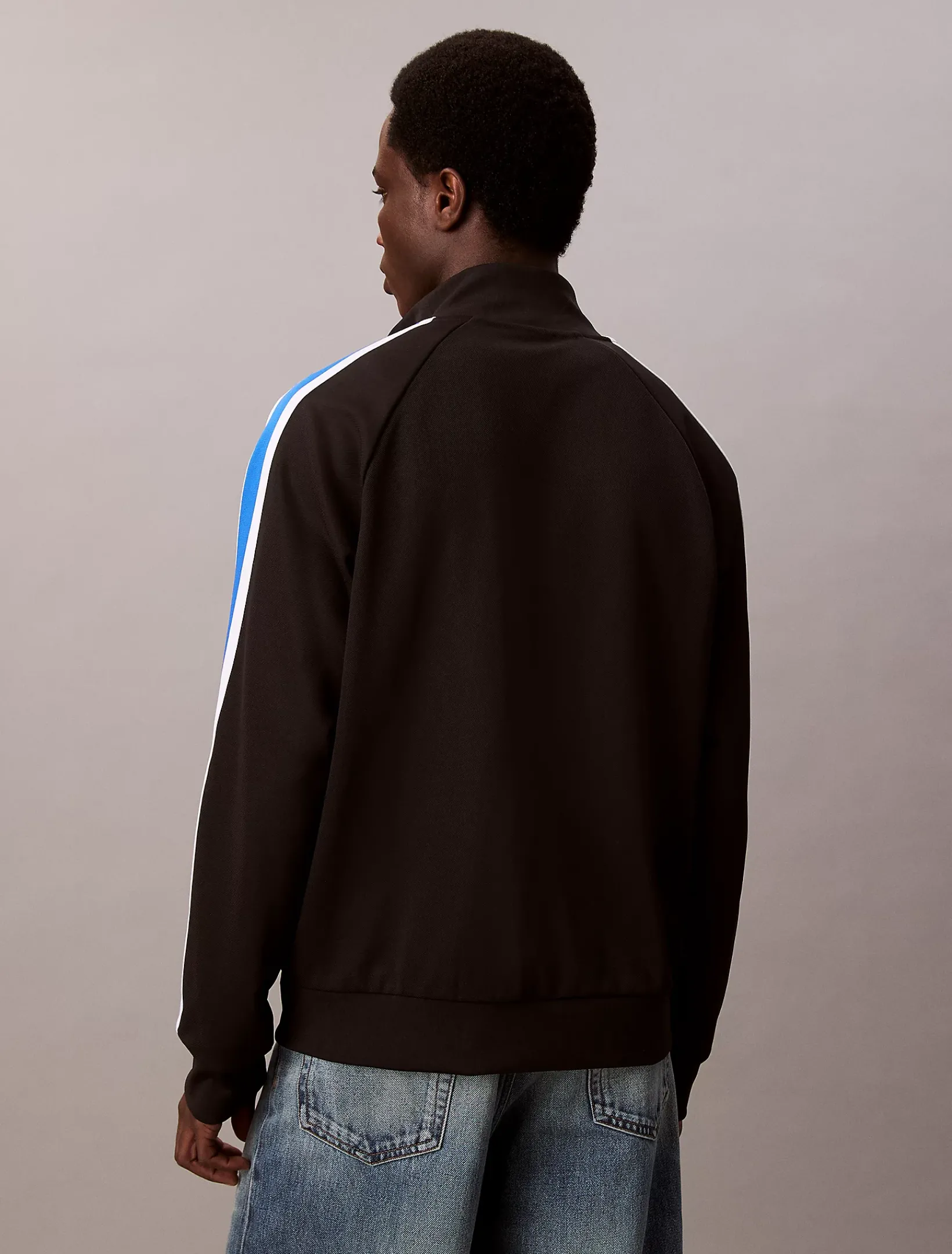 • Kontraststreifen-Besatz längs der Ärmel